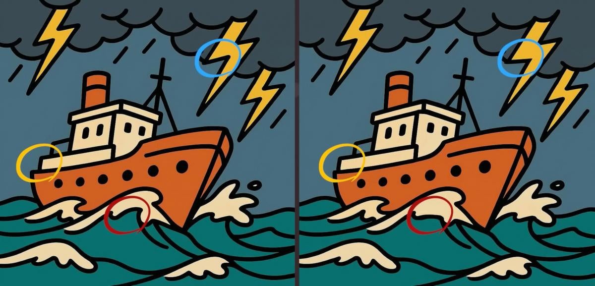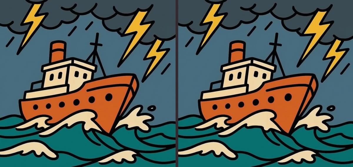 Дакле, да ли сте спремни за следећи изазов? Погледајте пажљиво две слике брода који плови кроз олују. Слике могу изгледати потпуно исто, али немојте се заваравати. Очекују вас три скривене разлике. Трик је у томе што имате само 65 секунди да их све пронађете. Пробајте и тестирајте своју оштрину вида!