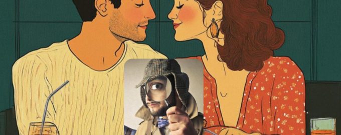 Ево заљубљеног мушкарца и жене који пријатно комуницирају током романтичне вечере. Девојка носи елегантну хаљину, а момак лагани џемпер. На столу можете видети чаше пића и нека укусна јела. На зидовима објекта висе слике, а са плафона висе сијалице.