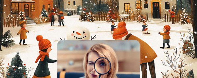 Испод ћете видети слику завејаног трга где људи шетају. Неки људи играју грудве, други праве снежака или се једноставно диве зимском пејзажу.