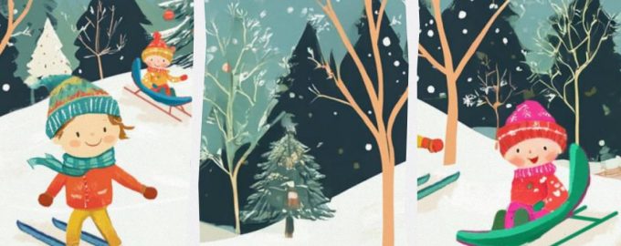 Ево гомиле срећне деце која уживају у снегу и правом зимском времену у шуми. Деца иду на санкање, а њихови старији другари на скијање.