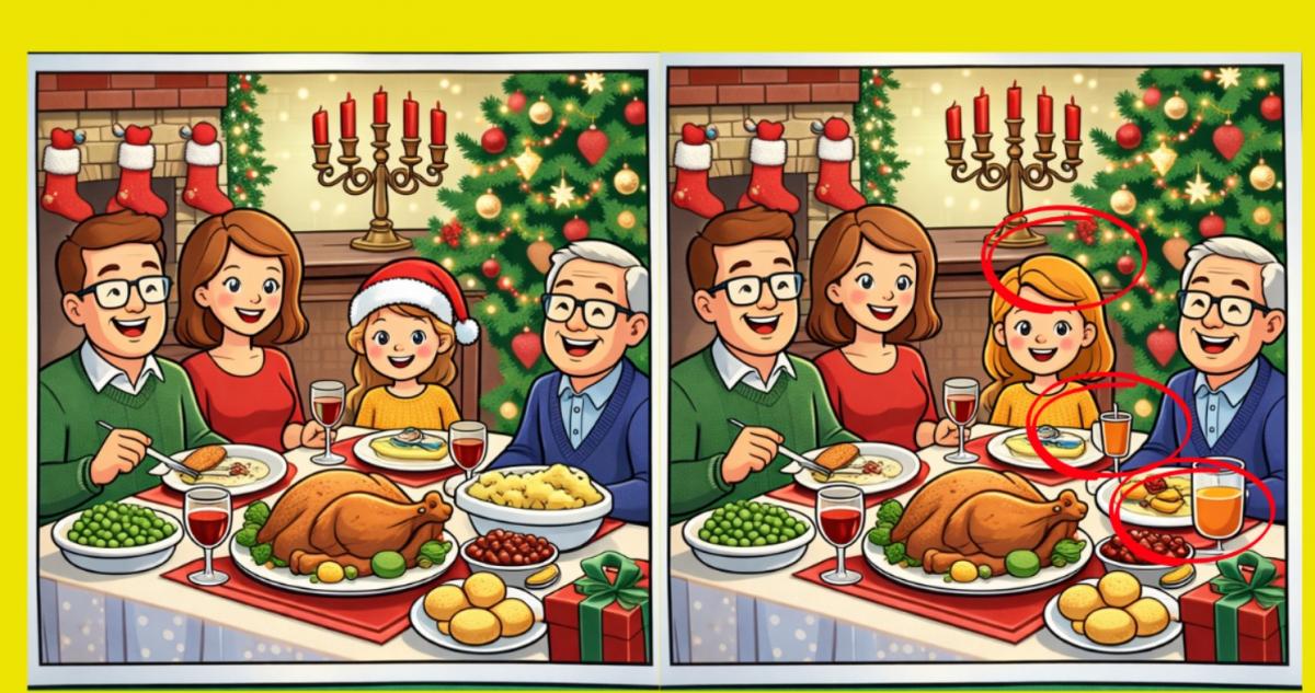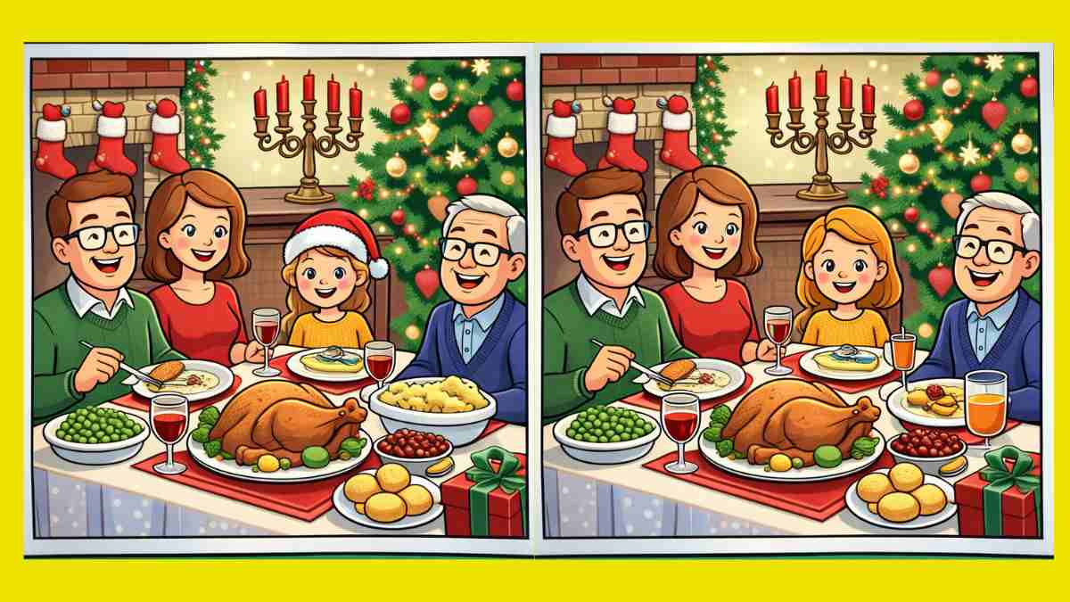 Дакле, да ли сте спремни за следећи изазов? Погледајте изблиза две слике породичне божићне вечере. На први поглед могу изгледати исто, али крију 3 мале разлике. Мислите да их можете пронаћи све за 16 секунди? Пробајте и тестирајте своју оштрину вида!