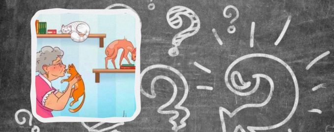 На слици је пензионерка окружена кућним љубимцима. Мачке и мачке различитих раса се играју и опуштају у соби. Можда се чини да на слици нема ништа сувишно, али то није тако – уметник је овде сакрио недоследност.