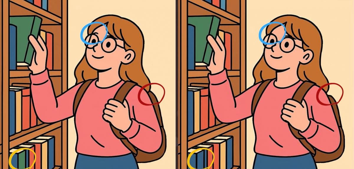 Дакле, да ли сте спремни за следећи изазов? Погледајте изблиза две слике девојке која бира књиге у библиотеци. На први поглед могу изгледати исто, али крију 3 мале разлике. Мислите да их све можете пронаћи за 19 секунди? Пробајте и тестирајте своју оштрину вида!