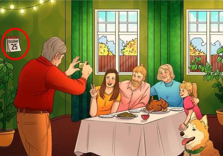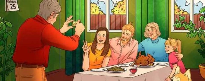 На следећој слици видимо породицу која се фотографише за столом за Дан захвалности. Да родбина слави Дан захвалности говори и традиционална ћурка за овај празник, коју видимо на трпези.
