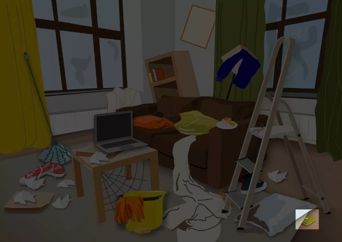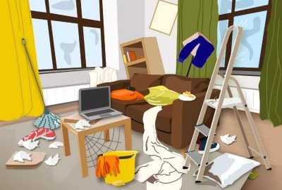Погледајте слику изнад. Приказује дневну собу којој је потребно дубинско чишћење. На поду и намештају је одећа, јастуци на софи су срушени, а на зиду су искривљене слике. Ту су и мердевине, канта и гумене рукавице у центру собе, што сугерише да су власници кућа заузети дубинским чишћењем.
