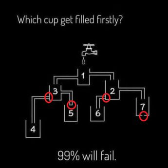 Објавили су Даили Куиз и Риддлес на Кс (раније познат као Твитер), ово је слика од седам шољица са натписом „Која шоља се прва напуни?“ Ово у почетку може изгледати једноставно за разумевање, али заправо приказује невероватну динамику воде. Прва шоља, испод славине, има две цеви на различитим нивоима које воде до две различите шоље, које имају своје цеви које воде до других шољица, пише Миррор.