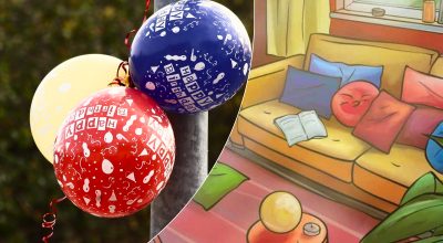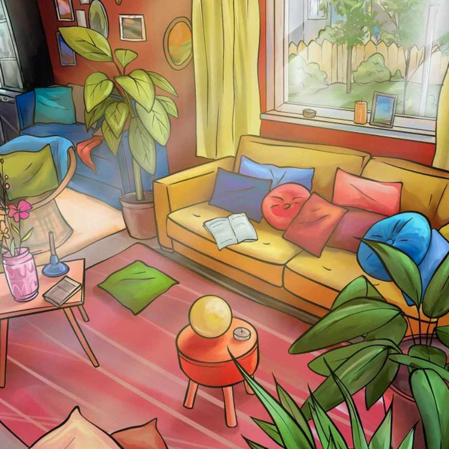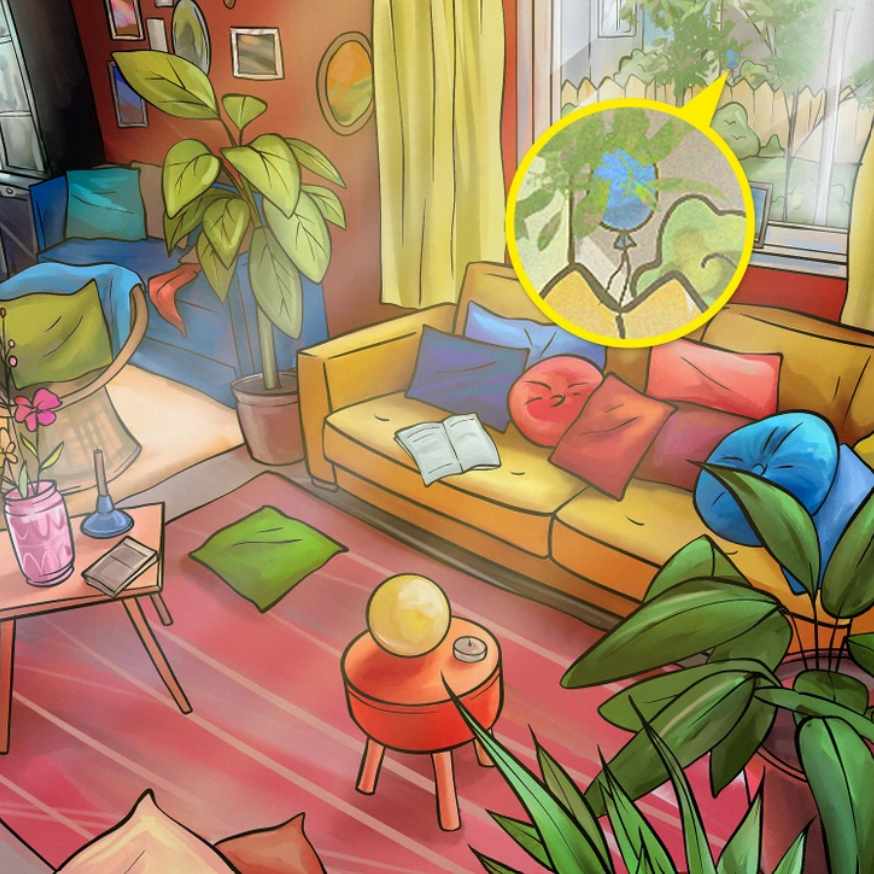 На слици изнад можете видети унутрашњост дневне собе. Испред великог прозора са погледом на башту налази се софа, саксији, столови и неколико јастука различитих облика. Негде на овој слици је сакривен балон. Можете ли да је нађете? У овој слагалици морате пронаћи балон у одређеном временском периоду.