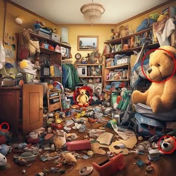 Пажљиво погледајте слику. У овом хаосу морате пронаћи четири плишана медведа, а једног је теже пронаћи од осталих.