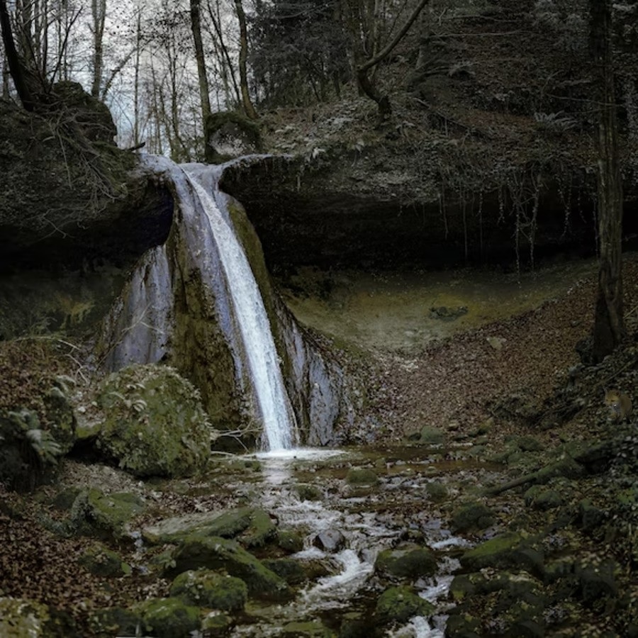 На фотографији видимо шумски пејзаж са водопадом. Вода пада на камење обрасло маховином које лежи испод. А шема боја која уоквирује шуму сугерише да слика приказује јесењи пејзаж.