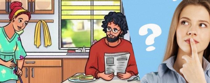 Слика приказује пар који ужива у дану у кухињи. Мушкарац чита новине и пије чај, а жена пере под. Охрабрујемо вас да приметите грешку скривену унутар ове слике. Морате пажљиво погледати слику пре него што одговорите на питање: „Шта није у реду са сликом?“ Да би игра била још занимљивија, покушајте да пронађете одговор у ограниченом времену – 11 секунди.
