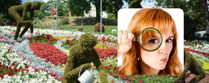 На слици испод можете видети светле цветне кревете у парку. Поред уобичајеног цвећа које ствара оригинални образац, на слици су приказане зелене скулптуре „вртлара“. Покушајте да пронађете малог врапца међу њима.
