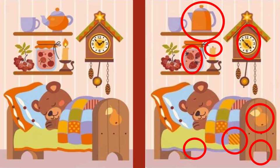У следећој загонетки треба да пронађете осам разлика између две слике медведа који спава у својој соби, пише јаграњош.