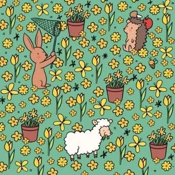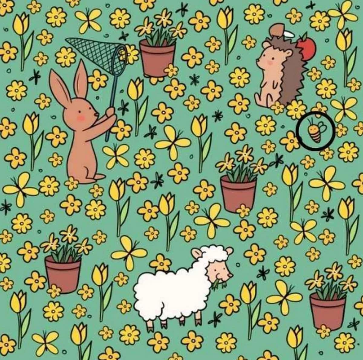 Дакле, сада погледајте слику испод. На слици је пуно јарко жутих цветова, као и зец са мрежом за лептире, јагње које једе траву и јеж.